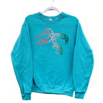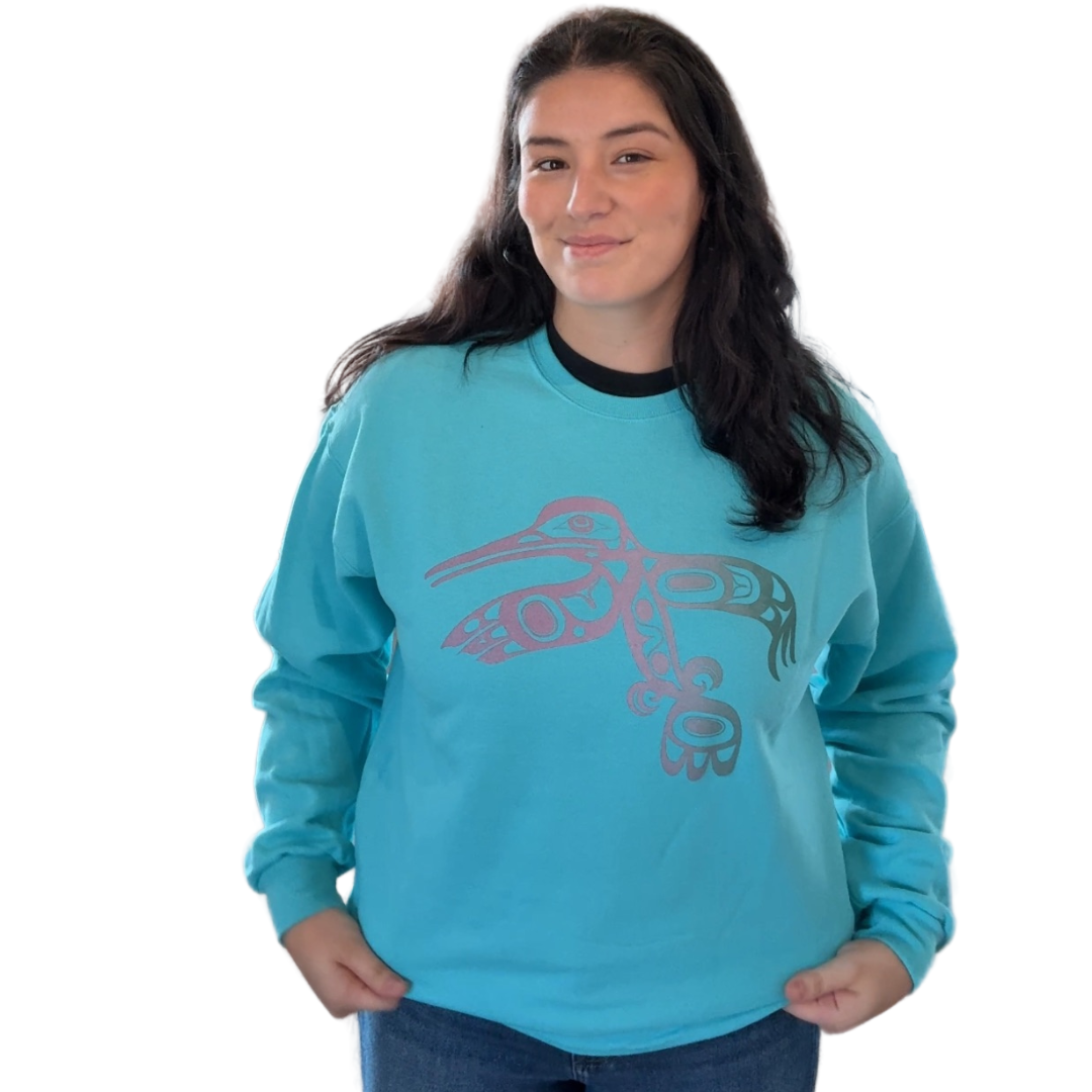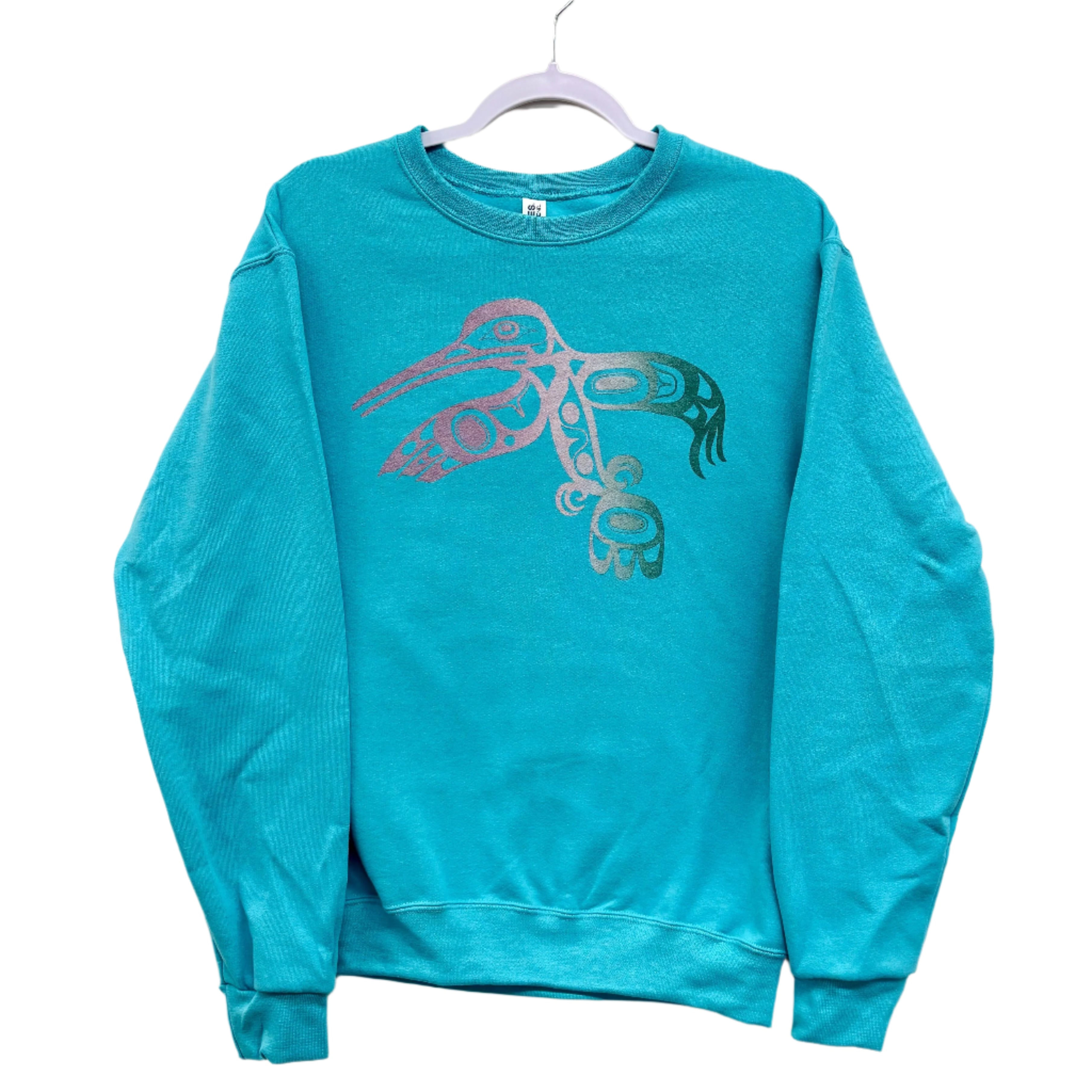 Achieve both comfort and style with our Scuba Blue Hummingbird Sweatshirt. Design created by Haida Artist Jesse Brillon. Printed with a tri-blend of eco-friendly water based inks, by us in our studio on the K'ómoks First Nation