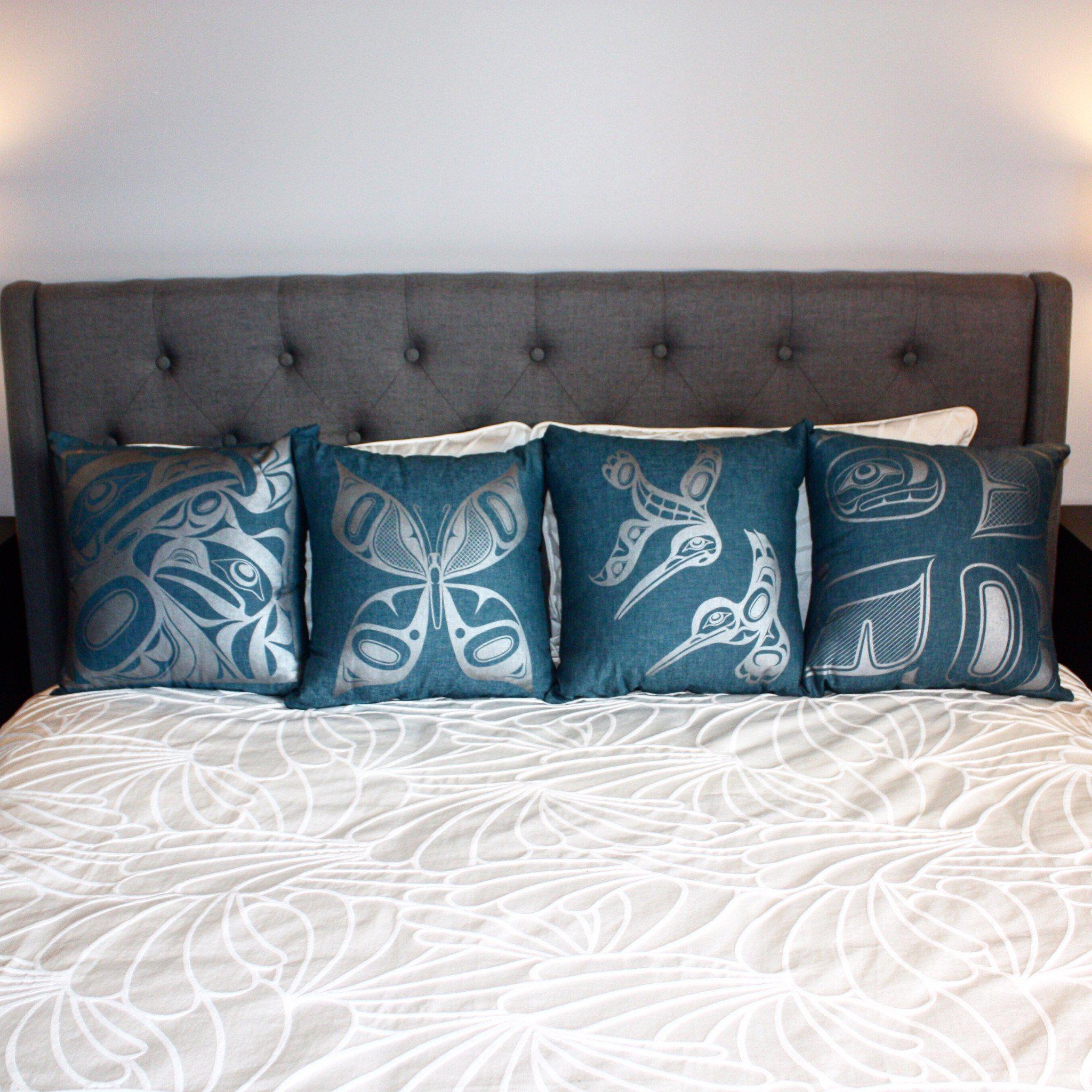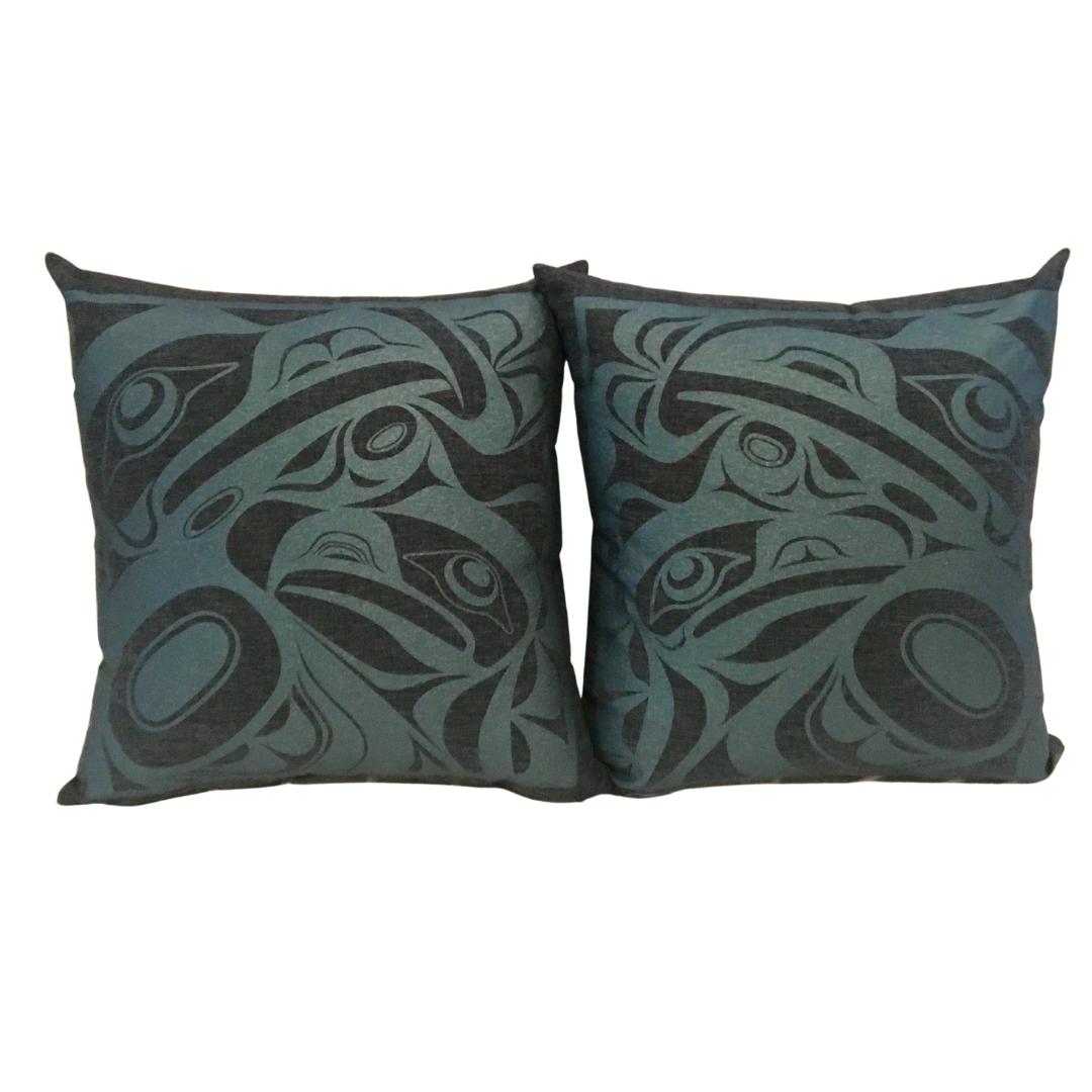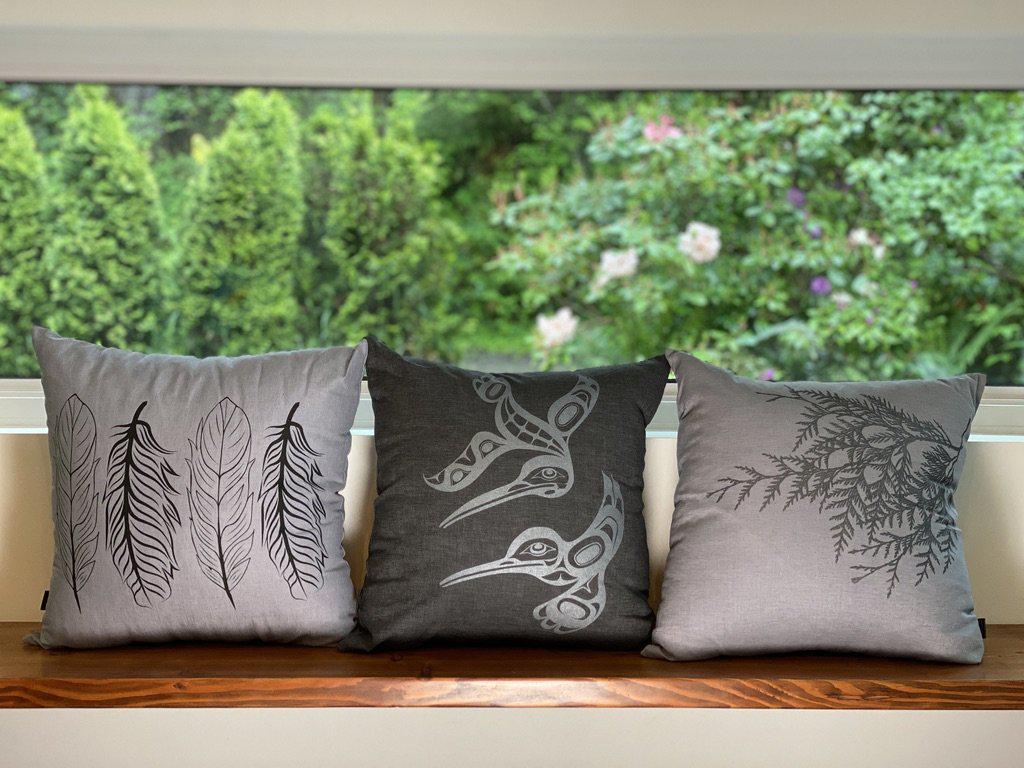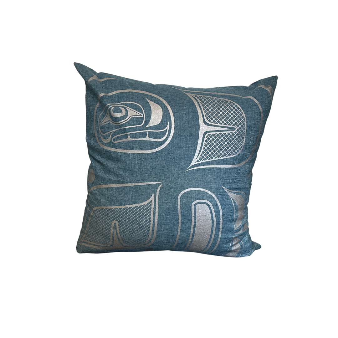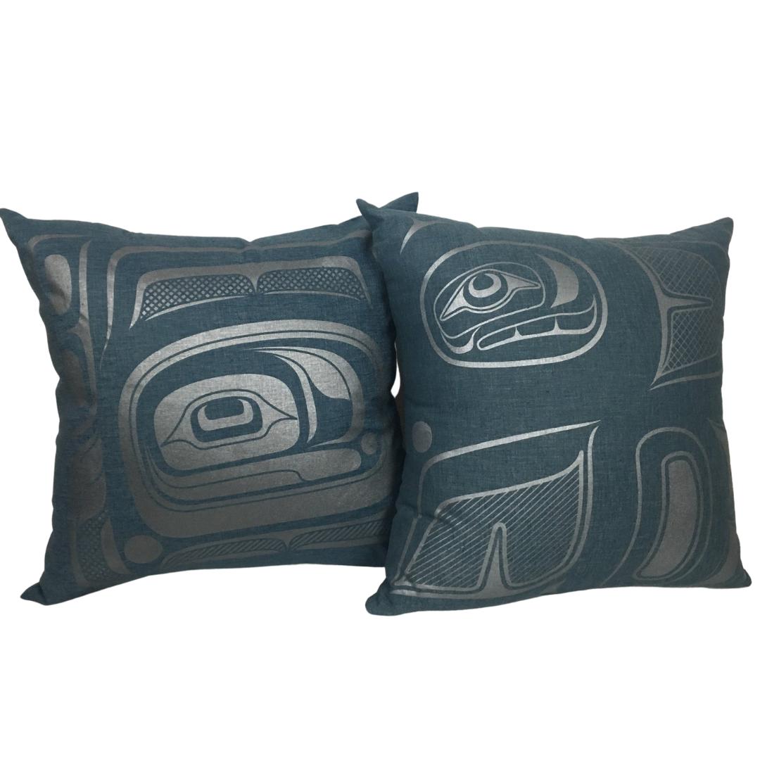 Each pillow is sewn locally and printed by us at Kwigwatsi Studio, K'omoks First Nation, Vancouver Island.