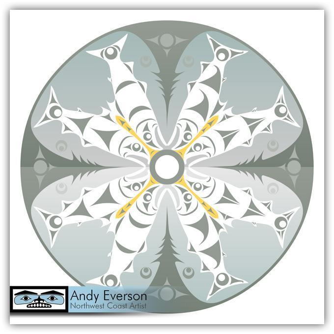 “Interconnections” is rendered in the ancient Coast Salish style. It appears in the form of a spindle whorl and is done in respect of my Great Grandmother, Mary Moon, who was a Salish weaver.