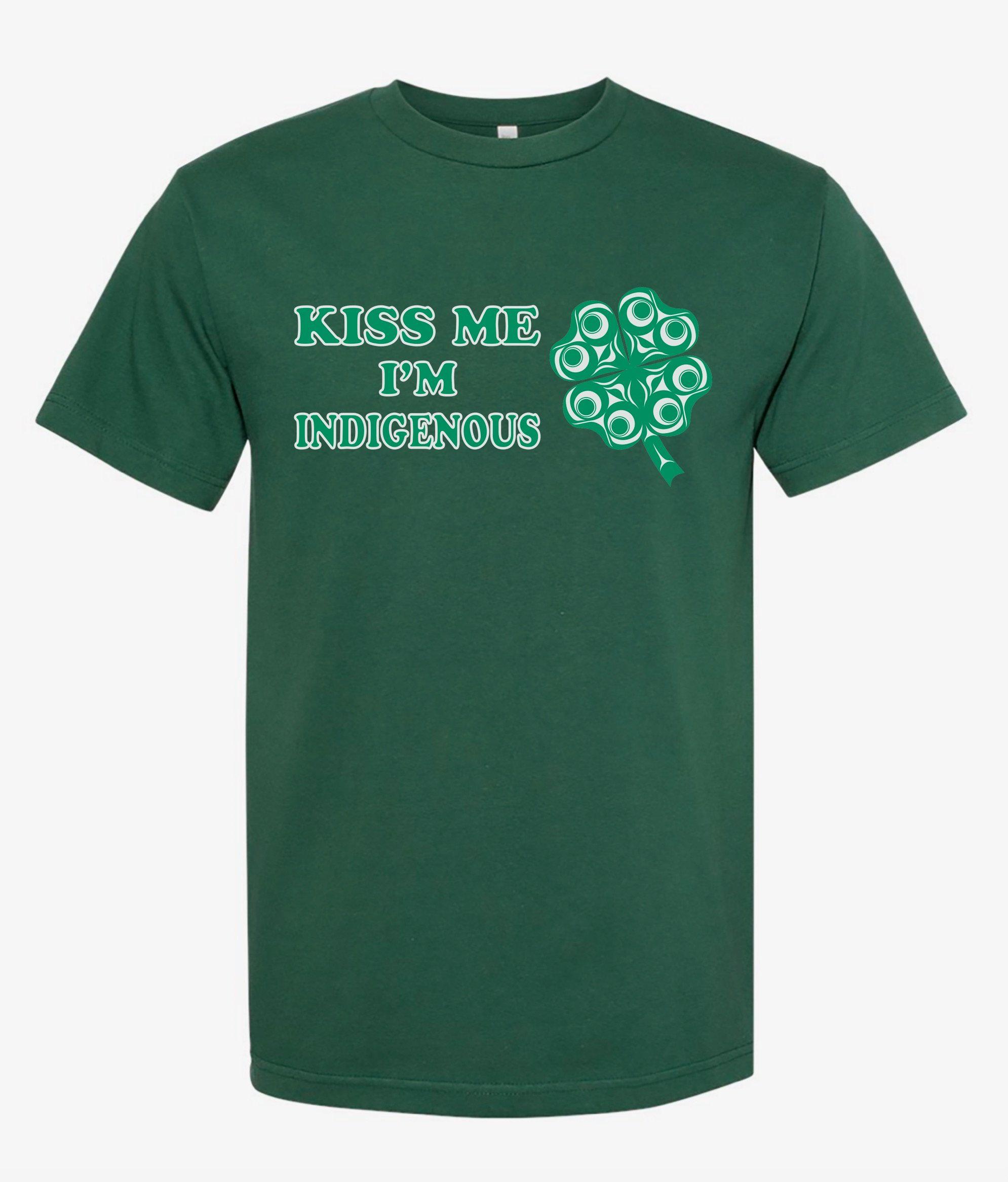 “Kiss Me I'm Indigenous” unisex t-shirt! Crafted with 100% cotton, this forest green tee is designed by Andy Everson and printed with water based inks - winning! Get your hands on it and pucker up!