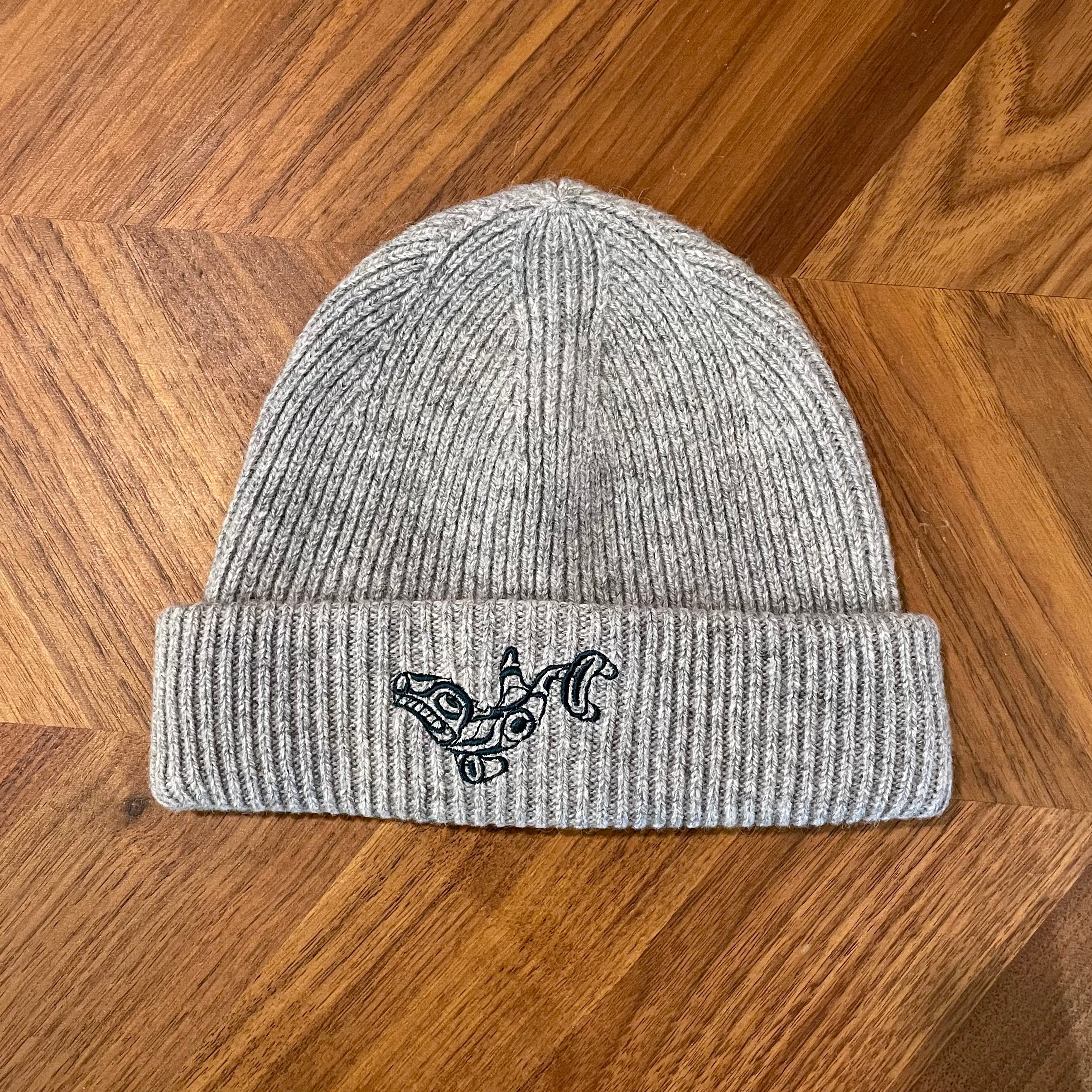 Grey wool winter hat with embroidered Killer Whale design by Haida artist Jesse Brillon