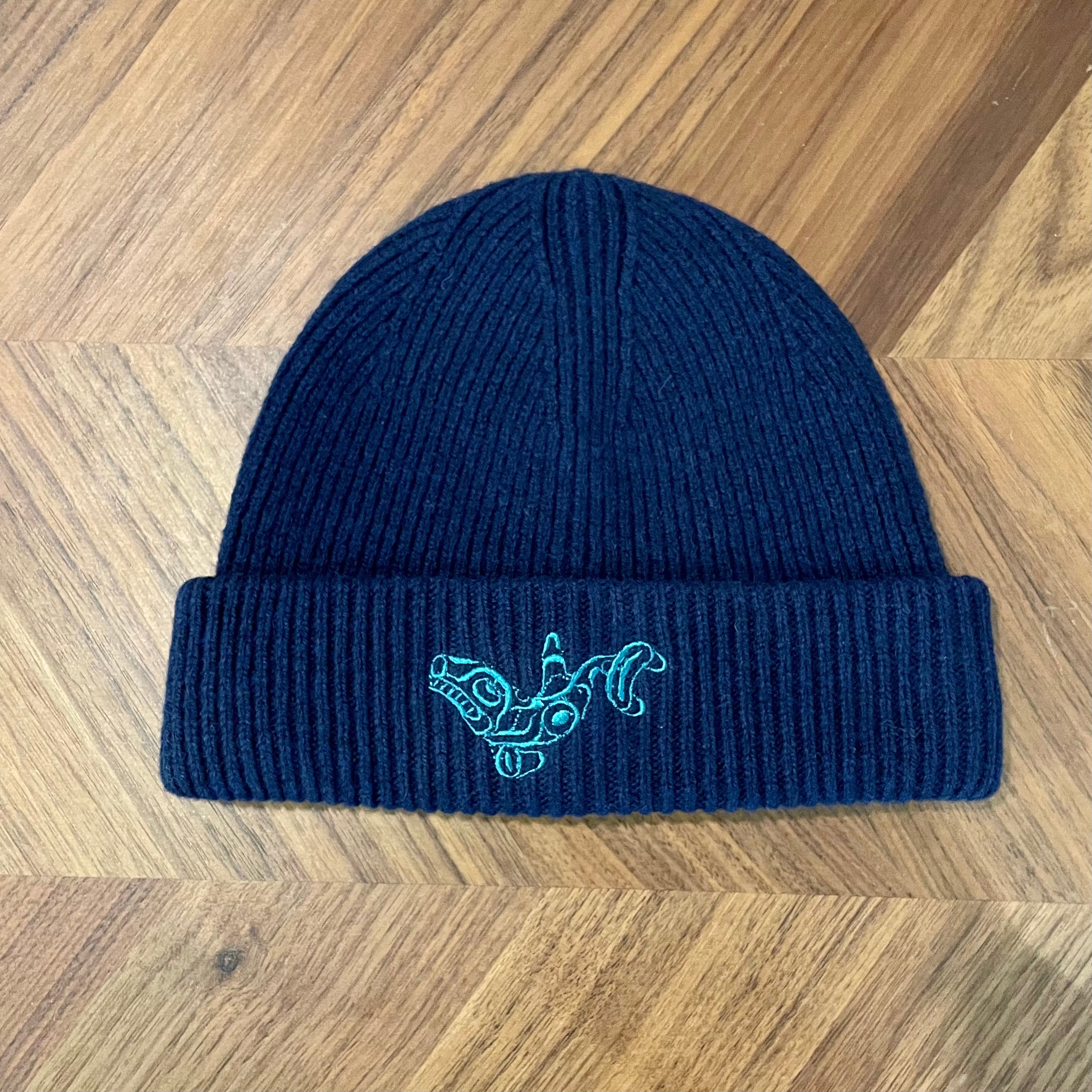 Blue wool winter hat with embroidered Killer Whale design by Haida artist Jesse Brillon