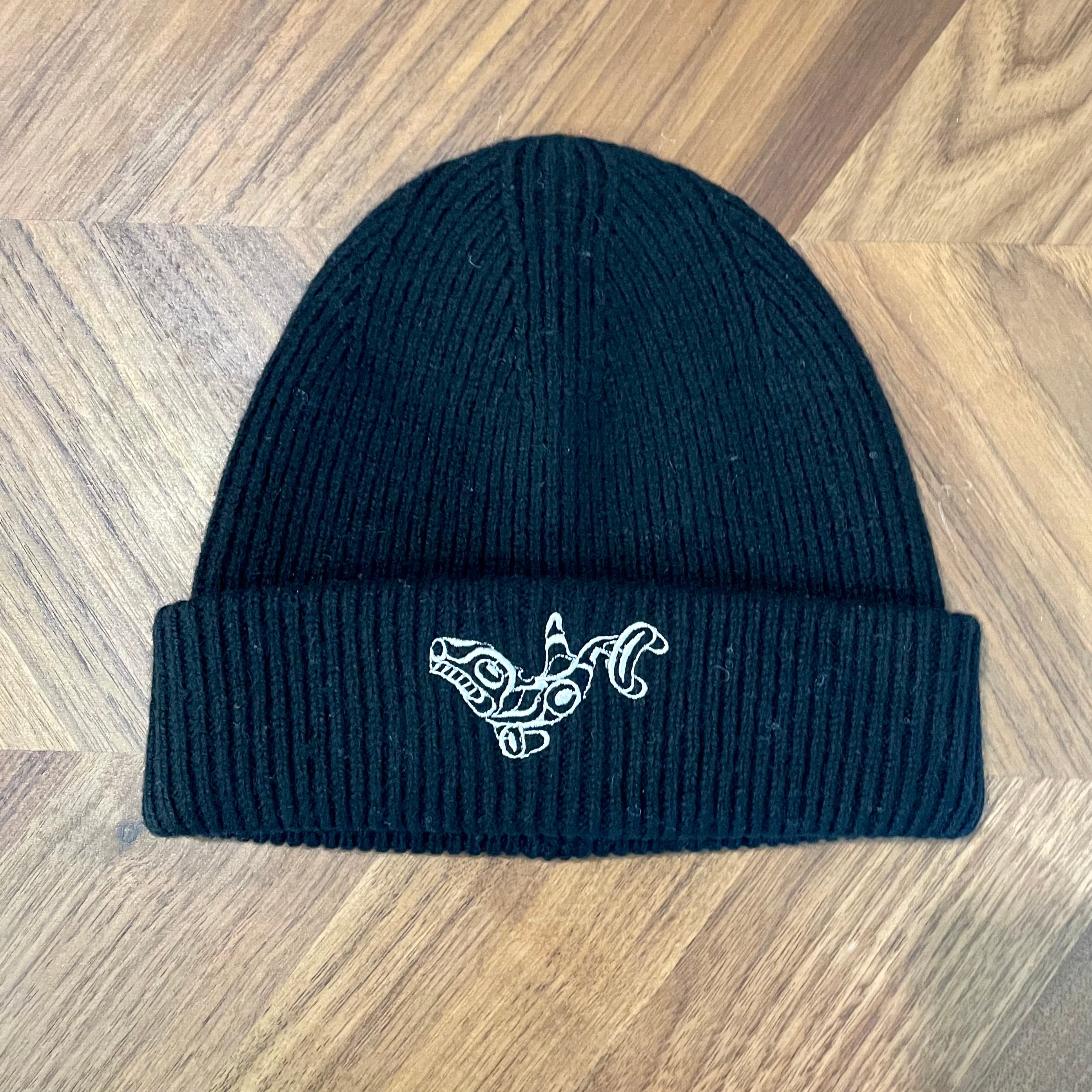 Black wool winter hat with embroidered Killer Whale design by Haida artist Jesse Brillon
