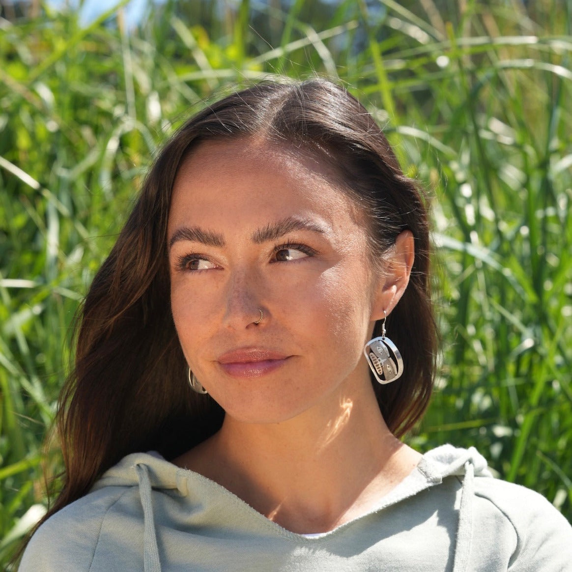 These Chilkat Earrings feature a design by renowned artist Andy Everson and handcrafted by Totem Design House. Crafted from sterling silver, they measure 1.25" x 7/8" wide not including the hook.