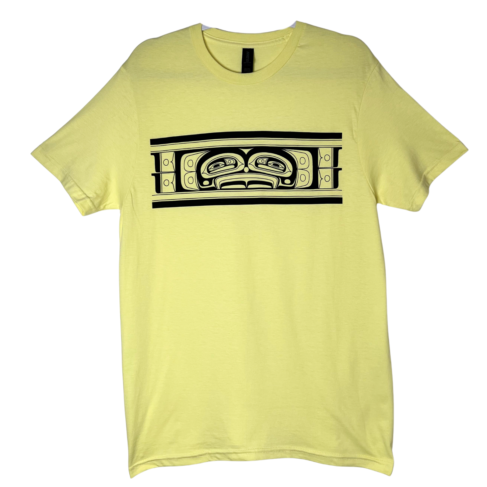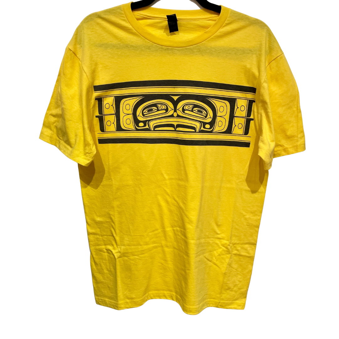 This Unisex Chilkat Design T-Shirt by Haida Artist Jesse Brillon stands out with its captivating artwork. Choose between the fresh NEW colour Flaxen or classic Daisy (Yellow) colors, both crafted from 100% cotton for comfort and durability. Printed using black eco-friendly water-based ink and water-based discharge ink, these tees deliver an ultra-soft feel. Perfect for celebrating traditional and contemporary art, this shirt offers a timeless and stylish way to showcase your appreciation.