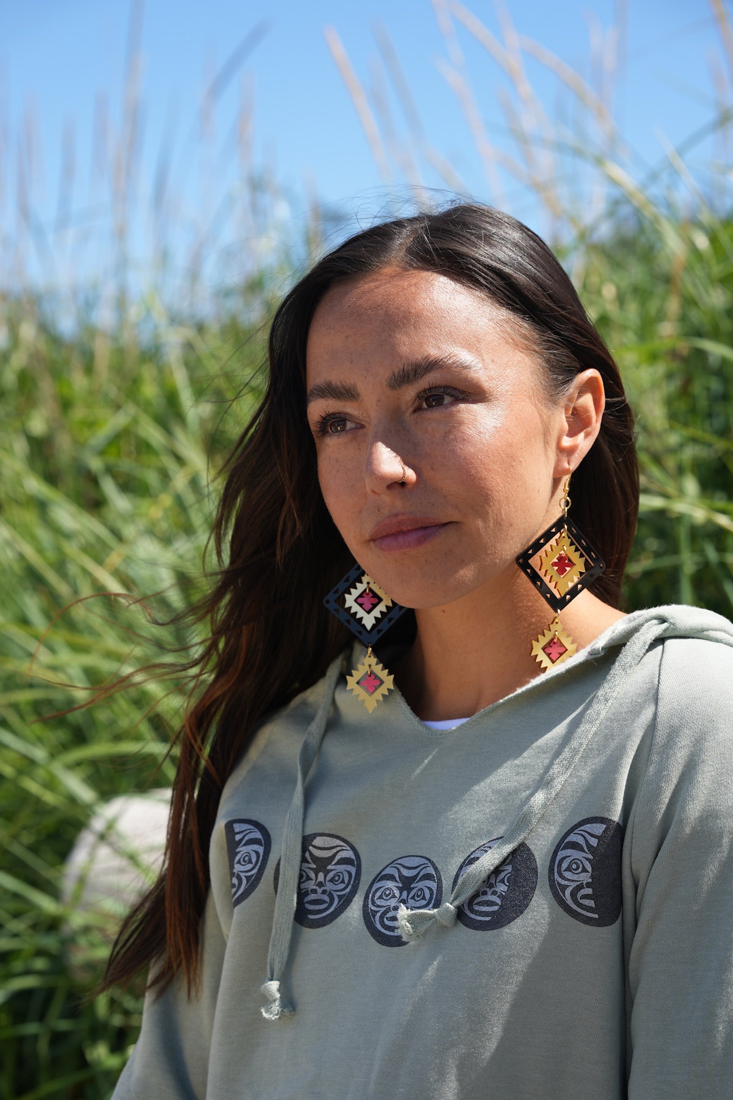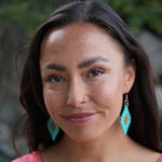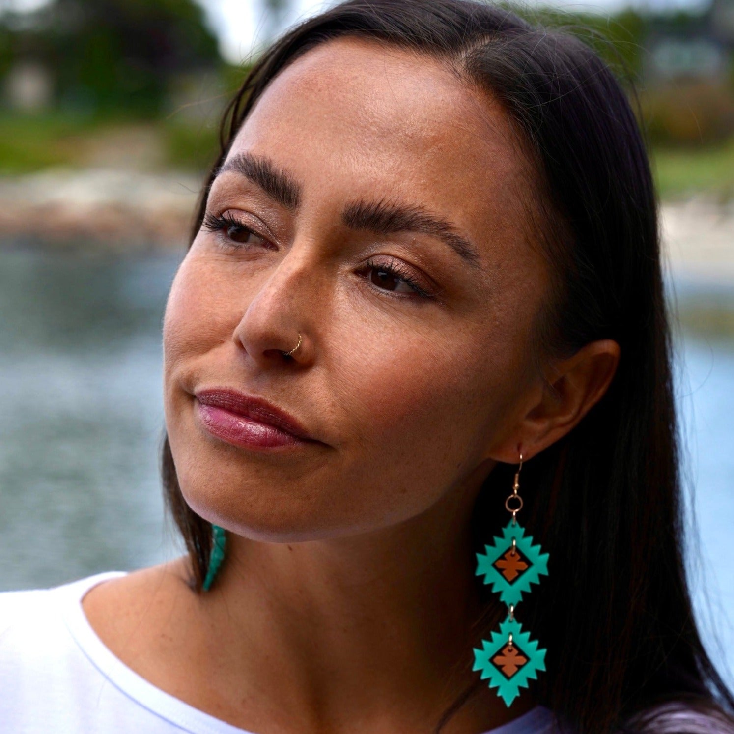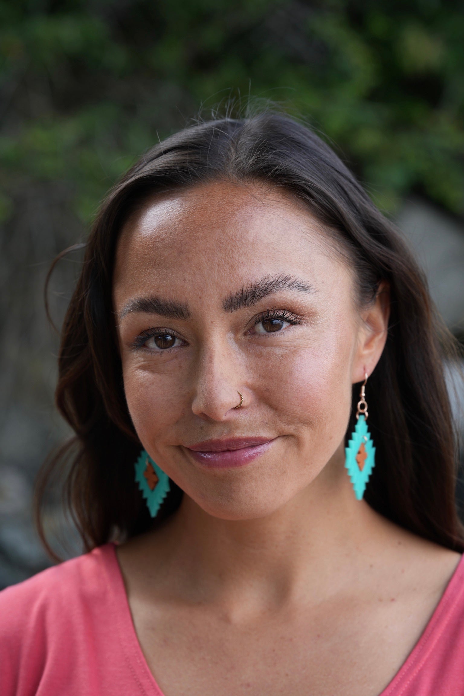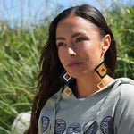 Plains Points Earrings are inspired by the weaving patterns of plains Indigenous peoples, designed by Erin to represent her Cree heritage.